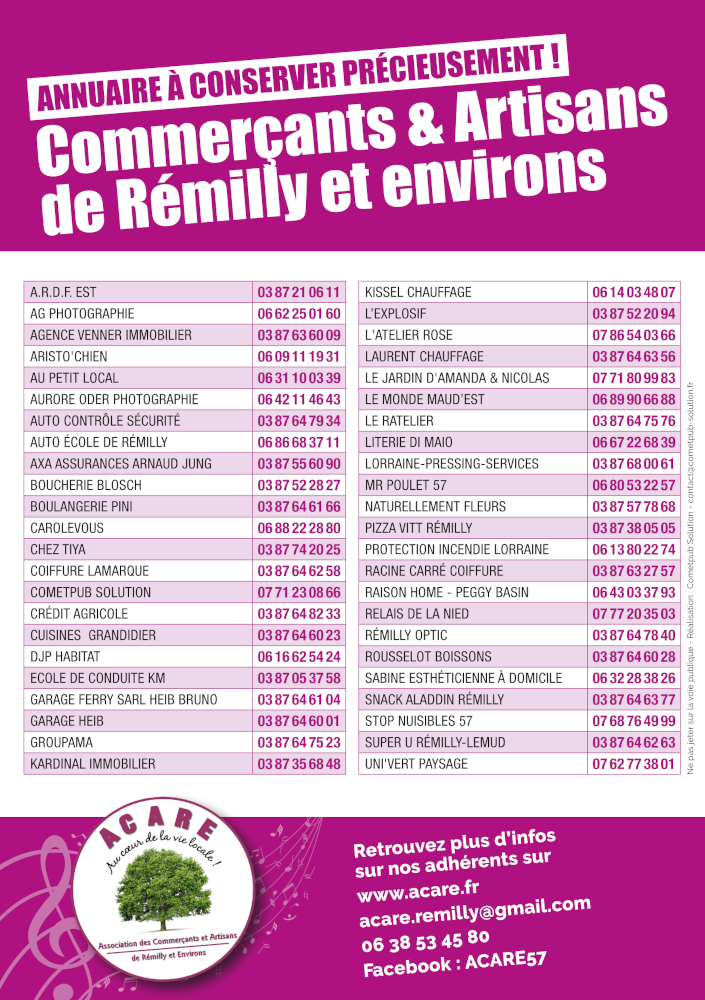 Nos adhérents, les commerçants et artisans de Rémilly et environs, que vous avez l’habitude de voir dans leurs activités respectives et à votre service, vous attendent aussi :